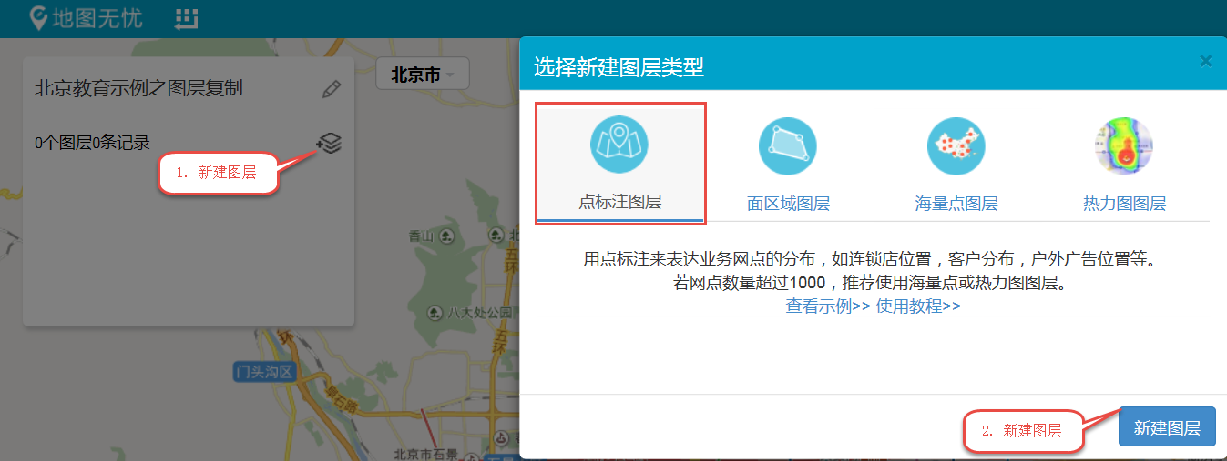 点击“新建图层”按钮,弹出“选择新建图层类型”对话框,选择“点标注图层”,点击“新建图层”;