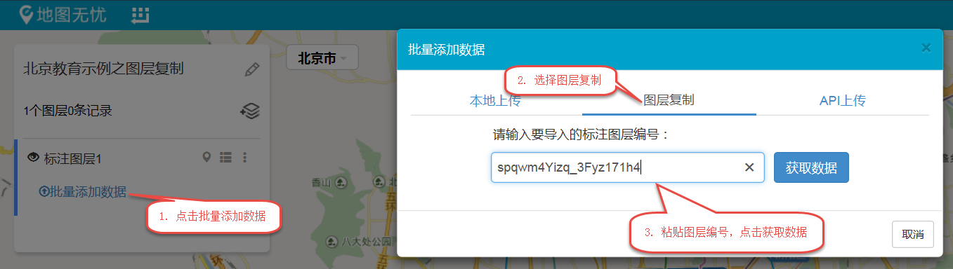 点击“批量添加数据”按钮,弹出“批量添加数据”对话框,选择“图层复制”,粘贴图层编号,点击“获取数据”按钮即可大功告成。