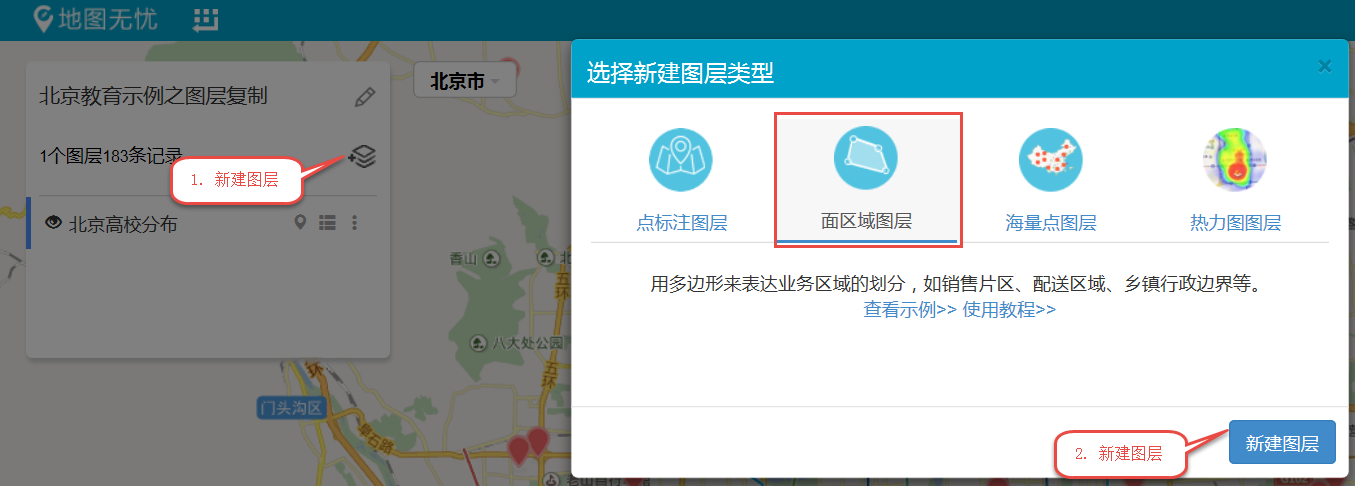 点击“新建图层”按钮,弹出“选择新建图层类型”对话框,选择“在区域图层”,点击“新建图层”;