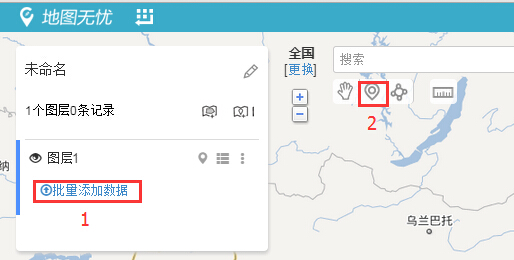 2、在新建的图层下面,添加你的网点标注。有2种方式:(1)使用“批量添加数据”工具进行批量标注,适用于批量标注较多的数据。(2)使用点标注工具