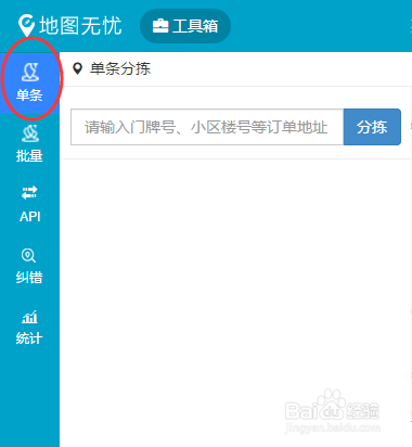 点击【单条】进入单条分拣页面。单条分拣多用于实时订单配送业务,以蛋糕配送为例,输入一个地址,回车即可得到该地址所属门店,即而通知该门店对订单进行处理。如果企业有自己的订单系统,可以使用鸿雁分单进行API对接,将订单处理更加智能化。