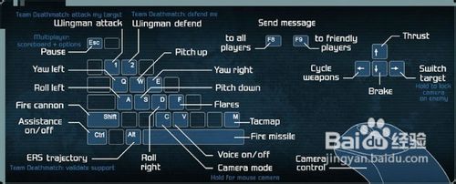 PC键位操作说明一:(这个按键示例中,W是机头朝下,S是机头向上,A是左翻滚,D是右翻滚,Q是水平往左,E则是水平往右,上下左右,分别是:加速、减速、选择武器、切换目标)