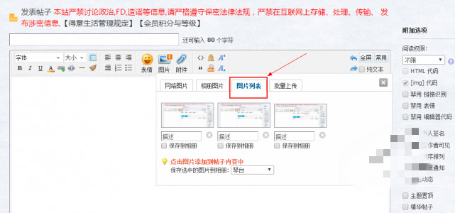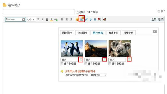 找到自己的帖子,点编辑,点击编辑器中的上传图片按扭,如下图,在图片列表中,点击小“X”,之后提交该帖子就会删除图片。