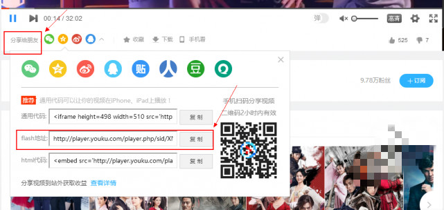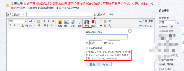 到视频网站中的分享,在帖子发布页面点击复制flash代码,粘贴就可以了。
