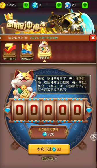 我们要知道开区第一天最重要的是什么?没错就是经验,经验是每个游戏里最重要的,这个游戏也不例外,有了经验,我们就有了更高的等级,等级高了,我们可以打更厉害的组队副本,挂每分钟经验更高的BOSS图,穿名字更炫酷的装备.所以新区的招财猫活动和冲榜礼包有可以让我们实现这个目地.