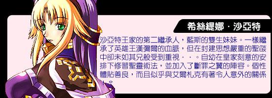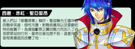 西撒.赤红.圣亚里昂,南方圣焰联合王国中,圣亚里昂领的少主,同时也是圣焰英雄雷欧哈特的独子。在圣焰与西方异邦数年来的战斗中,多次展现其优越的指挥能力,屡屡大破对手阵营,赢得多次压倒性的胜利,有“修罗将军”的称号。
