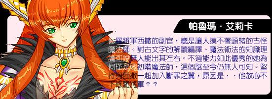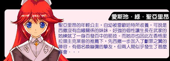 爱斯玲.绿.圣亚里昂 圣焰的英雄-雷欧哈特之女,同时也是修罗将军-西撒之妹。虽身为女儿身,但在其父与其兄诸多英雄事迹的渲染下,爱斯玲亦有着一手习自挚友幽弥的百步穿杨、巧射弓技。