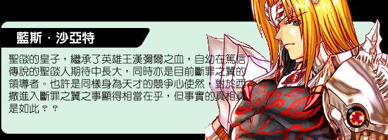 圣焰联合王国之王-杰奥斯的独子,同时也是传说中的英雄王汉弥尔仅存的唯一后裔。身为圣焰长老院公认的圣焰王唯一继承人,蓝斯自小便有着超越同龄竞争对手的优越表现:从剑技到指挥调度的能力,都是当之无愧的少年英雄。