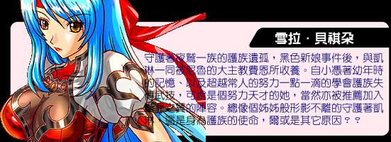 “黑色新娘的悲剧”发生后,守护魔女亚蒂玛的“护之一族”幸存者。遵循着古老的契约,自凯琳尚年幼之时,便一直守护在她身边。对年幼即逢丧母之痛的凯琳而言,雪拉就如同自己的亲姐姐一般重要。