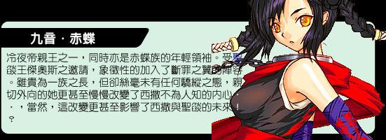 代表着冷夜帝国的三大族-雪狼、焰枭与赤蝶族中,率领着赤蝶族的19岁少女。因其父母均早逝于数年前的冷夜建国战争之故,自幼便被迫扛起族长之责的她有着强于他人数倍以上的责任感。