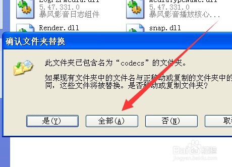 4、之后我们把这个文件拷贝到这里,当然它会它会提示是否覆盖,你点击全部是即可。注意:要把暴风影音给关了在拷贝,不然一些拷贝不上