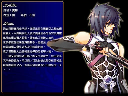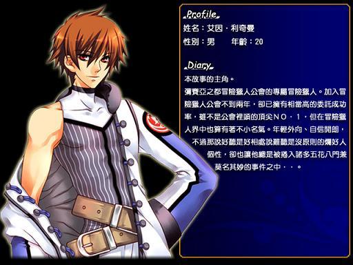弥赛亚之都冒险猎人公会的专属冒险猎人。加入冒险猎人公会不到两年,却已拥有相当高的委托成功率,虽不是公会里头的顶尖NO.1,但是在冒险猎人界中也算有着不小名气。年轻外向、自信开朗,不过那说好听是好相处;说难听是没原则的烂好个性,却也让他总是被卷入诸多五花八门兼莫名其妙的事件之中……