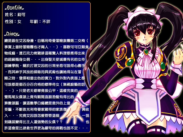 总是跟在艾因身边,自称利奇曼冒险旅团第二交椅(事实上当时冒险团也才两人),喜欢可可亚类食物成痴,连巧克力烤猪排这种惊人料理都煮得出来的超级随身女佣。出身圣天使城最有名的女侍训练学院,关于打理艾因的日常作息可说得心应手,而其相当出色的实力,对外对内表面上都可说是个百分百合格的标准侍女(无视厨艺的话……)。