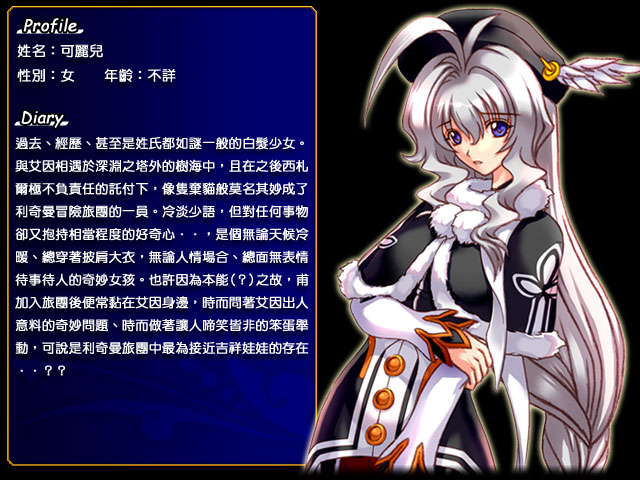 过去、经历、甚至是姓氏都如谜一般的白发少女。与艾因相遇于深渊之塔外的树海中,且在之后西扎尔极不负责的托付下,像只弃猫般莫名其妙地成了利奇曼冒险旅团的一员。冷淡少语,但对任何事物却又保持相当程度的好奇心……是个无论天候冷暖、总穿着披肩大衣,无论人情场合、总面无表情待事待人的奇妙女孩。也许因为本能(?)之故,甫加入旅团后便常粘在艾因身边,时而问着出人意料的奇妙问题,时而做着让人啼笑皆非的笨蛋举动,可说是利奇曼冒险旅团中最为接近吉祥娃娃的存在?