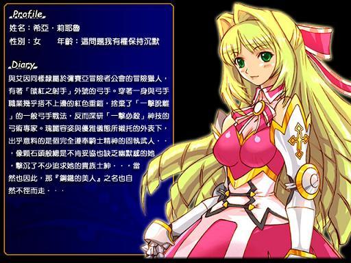 与艾因同样隶属于弥赛亚冒险者公会的冒险猎人,有着「焰红之射手」外号的弓手。穿着一身与弓手职业几乎搭不上边的红色重铠,舍弃了「一击脱离」的一般弓手战法,反而深研「一击必杀」神技的弓术专家。
