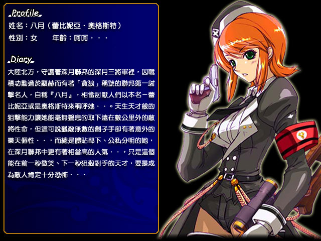 大陆北方,守护着深月联邦的深月三将军中,因功勋显赫而有着「贪狼」称号的联邦第一射击名人,自称『八月』,相当讨厌人们以本名——蕾比妮亚或是奥格斯特来称呼她。
