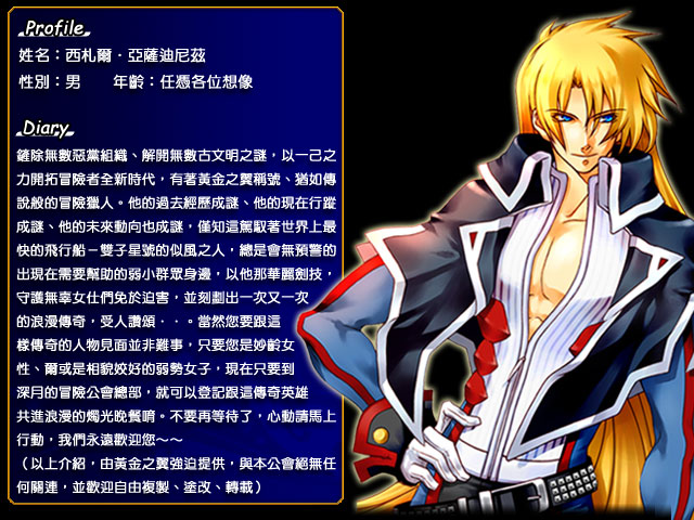 当然您要想跟这样传奇的人物见面并非难事,只要您是妙龄女性火是相貌姣好的弱势女子,现在只要到深月的冒险公会总部,就可以登记跟这传奇英雄共进浪漫的烛光晚餐唷!不要再等待了,心动请马上行动,我们永远欢迎您~(PS:以上介绍由黄金之翼强迫提供,与本公会绝无任何关联,并欢迎自由复制、涂改、转载)。