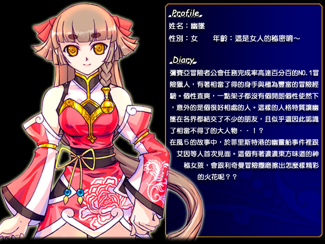 弥赛亚冒险者公会任务完成率高达100%的NO.1冒险猎人,有着相当了得的身手与极为丰富的冒险经验。个性直爽,一点架子也没有;在开朗个性使然下,意外的是个很好相处的人。这样的人格特质让幽坠在各界都结交了不少的朋友,且似乎还因此认识了相当了不得的大人物……
