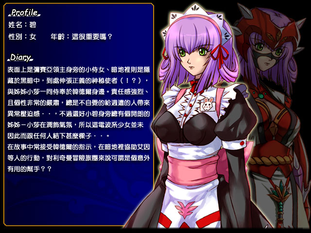 表面上是弥赛亚领主身旁的小侍女、暗地里则是隐藏与黑暗中,到处伸张正义的神秘使者?与姐姐小莎一同侍奉于韩德尔身边。责任感强烈、且个性非常的严肃,总是不自觉地给周遭的人带来异常压迫感……不过还好小碧身旁总有个开朗的姐姐——小莎在润饰气氛,所以这电波系少女并未因此从而跟任何人结下什么梁子。