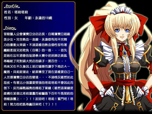 冒险猎人公会弥赛亚分店店长,自称弥赛亚超级美少女。完全热血一直线,永远都有用不完精力的暴冲火车头。不过这样的热血个性却有着纤细柔弱又好欺负(自称)的一面……首先是她在忘年酒会的划酒拳大赛中把招牌店员凯蒂输给了死对头大凶店的头子——黑百合,再来又在不久之后因上班打瞌睡而让手下商店A魔恩·贝莉丝溜走,结果导致了现在这样要自己一个人苦撑弥赛亚分店的窘境……