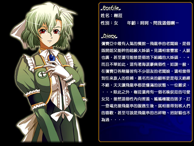 弥赛亚中最有人气的餐馆——飞龙亭的老板娘,是个既开朗又能干的超级大姐头。见识相当丰富,人脉也广,甚至还可能曾是个地下组织的大姐头……而且不单如此,这有着海派豪爽个性,如谜一般,在弥赛亚各阶层皆有不少朋友的老板娘,还相当得到往来旅人的信赖,慕名而来的顾客更是每天络绎不绝,天天让飞龙亭都是爆满的状态、一位难求……除此之外,榭菈还育有一个名唤荻菈的可爱女儿,当然这个性内向害羞、妈妈极宠的孩子,打一登场充当飞龙亭的服务生之后,就相当得到客人们的喜欢,甚至可说是飞龙亭的吉祥物、招财猫也不为过……