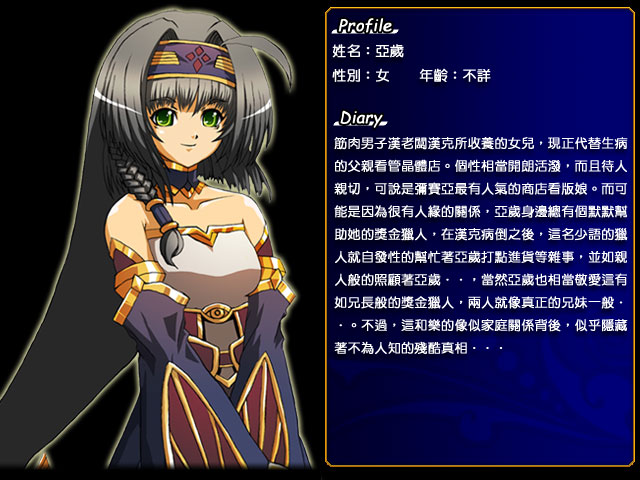 筋肉男子汉老板汉克所收养的女儿,现正代替生病的父亲看管晶体店。个性相当开朗活泼,而且待人亲切,可说是弥赛亚另一具有超人气的商店看板娘。而可能是因为很有人缘的关系,亚岁身边总有个默默帮助她的奖金猎人,在汉克病倒之后,这名少语的猎人就自发性地帮忙着亚岁打点进货等杂事,并如亲人般地照顾着亚岁……当然亚岁也相当敬爱这有如兄长般的奖金猎人,两人就像真正的兄妹一般……不过,这和乐的像似家庭关系背后,似乎隐藏着不为人知的残酷真相……