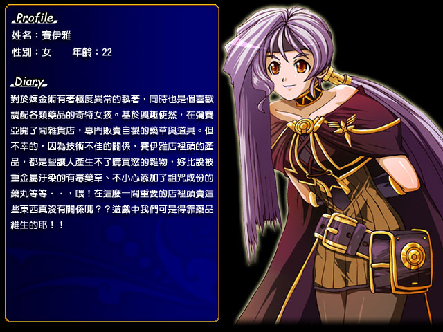 对于炼金术有着极度异常的执着,同时也是个喜欢调配各类药品的奇特女孩。基于兴趣使然,在弥赛亚开了间杂货店,专门贩卖自制的药草与道具。但不幸的,因为技术不佳的关系,赛伊雅店里头的产品,都是些让人产生不了购买欲的杂物,好比说被重金属污染的有毒药草、不小心添加了诅咒成分的药丸等等……