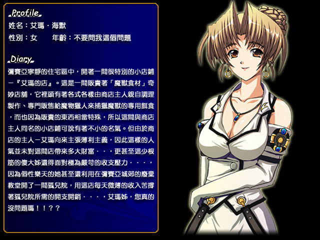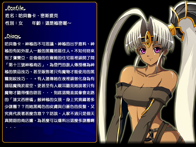 有人谣传她在夜里头曾化身为有翅恶魔飞于星空,更甚至有人亲耳听见她说着只有魔物才听得懂的语言……到底这简直就像会走路的「达文西密码」般神秘的女孩,身上究竟隐藏着多少谜团?而她黑褐色的皮肤与苍白的长发,又究竟代表着什么含义!?话说,人家不过是之是个天真开朗的商店娘,为什么可以爆料出这么多谜团啊……