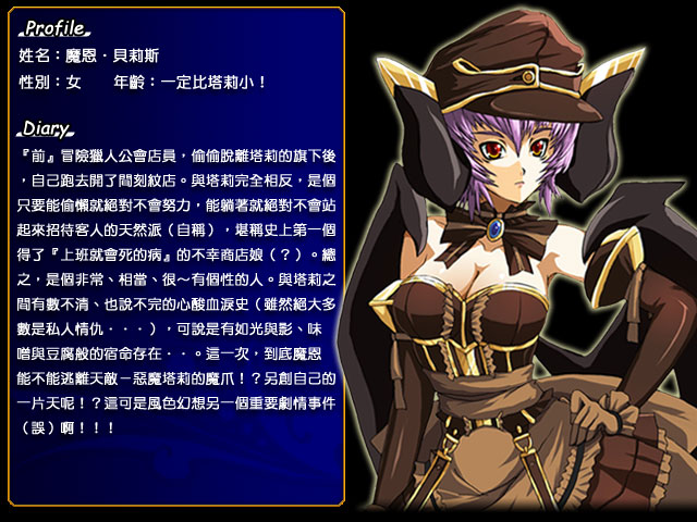 『前』冒险猎人公会店员,偷偷脱离塔莉的旗下后,自己跑去开了间刻纹店。与塔莉完全相反,是个只要能偷懒就绝对不会努力,能躺着就绝对不会站起来招待客人的天然派(自称),堪称史上第一个得了『上班就会死的病』的不幸商店娘(?)。总之,是个非常、相当、很——有个性的人。与塔莉之间有数不清、也说不完的心酸血泪史(虽然绝大多数是私人情仇……),可说是有如光与影、味噌与豆腐般的宿命存在。这一次,到底魔恩能不能逃离天地——恶魔塔莉的魔爪?另创自己的一片天地呢!?这可是风色幻想另一个重要剧情时间(误)啊!!