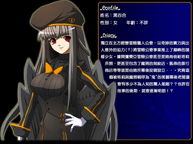 独立在北方经营冒险猎人公会,以奇妙的实力与出人意外的迫力(?)将冒险公会事业推上了巅峰的谜样少女。据闻弥赛亚冒险公会甚至是她商借给塔莉所开,更甚至包含了魔恩的刻纹店,凯蒂的旅行商店等等皆是由她所幕后投资设立……究竟这个被塔莉和魔恩称呼为“鬼”的美丽幕后老板还会有多少不为人知的惊人能耐??也许在故事的后期,就会逐渐明朗!?