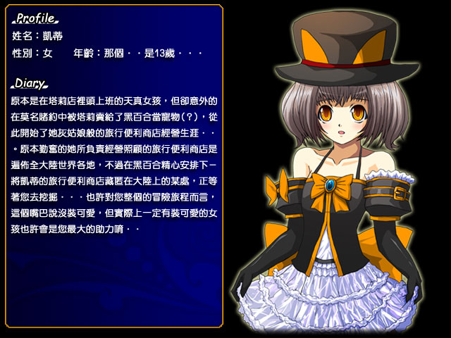 原本是在塔莉店里头上班的天真女孩,但却意外地在莫名赌约中被塔莉卖给了黑百合当宠物(?),从此开始了她灰姑娘般的旅行便利商店经营生涯……原本勤奋的她所负责经营照顾的旅行便利商店是遍布全大陆世界各地,不过在黑百合精心安排下——将凯蒂的旅行便利商店藏匿在大陆上的某处,正等着您去挖掘……也许对您整个的冒险旅程而言,这个嘴巴说没装可爱,但实际上一定有装可爱的女孩也许会是您最大的助力唷……