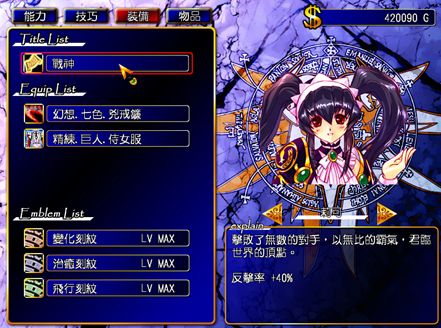 第一次写攻略,主要是网上的攻略太乱了,打通2遍以后才基本把称号收集齐,(第一武人不会拿,挑战者还没去玩HARD难度,没法提供截图,哈哈)风色幻想5也是偶6年来第一次不修改玩的游戏,只想说对FY说声又不是网游,把游戏搞得这么费时间,脑袋有问题,所以攻略对应的是普通或容易难度,HARD难度血少魔少敌人血多,烦,不推荐一开始就HARD难度:)