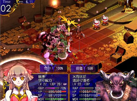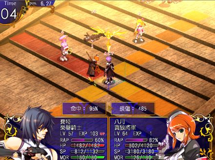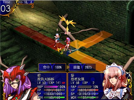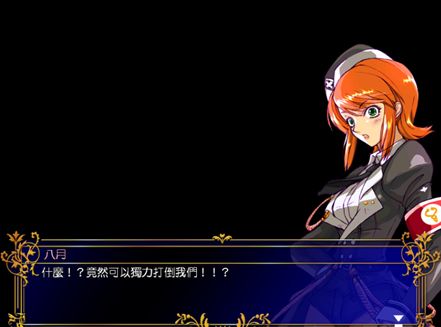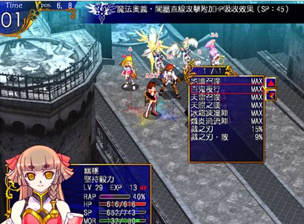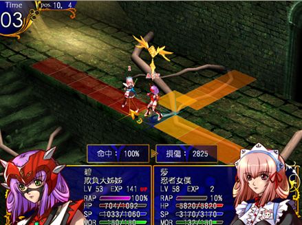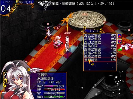 在台阶顶了把希亚的攻击调整至最高,再用鼓舞把斗志升至120,用凤凰破天式,把小兵全灭,剩下八月很难在一回合内灭了,梅鲁下去扔颗失力粉,她反应值也挺高,所以只能把她打将近一半血,这样她就不会使出那招“穿魂魔弹击”了,下回合灭她还是很轻松的……一周目的图,难度容易呵呵