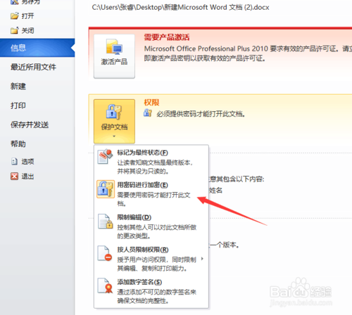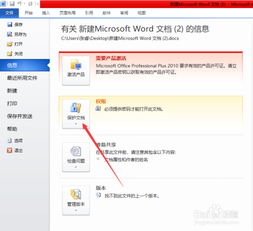 点击文件按钮后直接就可以看到箭头指的选项,即保护文档。