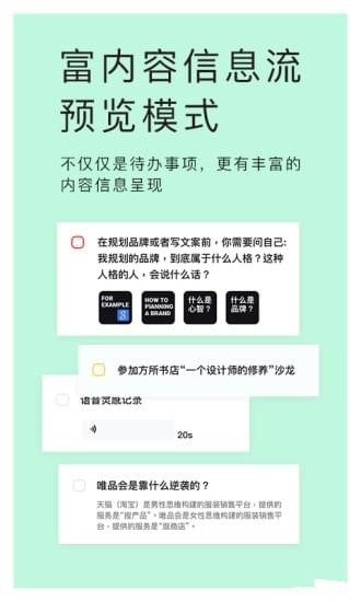 复内容信息流预览模式:不仅仅是待办事项,更有丰富的内容信息呈现顺滑流畅的UX手势操作:记事管理也要和舒适感