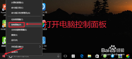 首先打开电脑控制面板,因为小编是Windows10系统,开始菜单点击右键,打开。