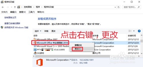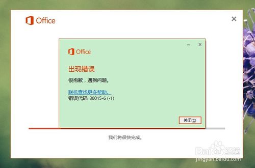 Office2016安装出现错误代码30015怎么办?安装中,快完成时如果出现错误代码,关闭即可,打开控制面板中的程序卸载,选中office,再点“更改”,出现如图修复窗口;