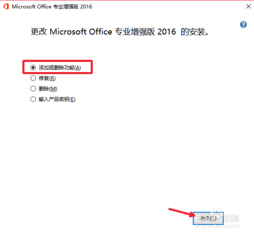 更改OFFICE安装窗口,我们选择添加或删除功能,点击右下角继续操作。