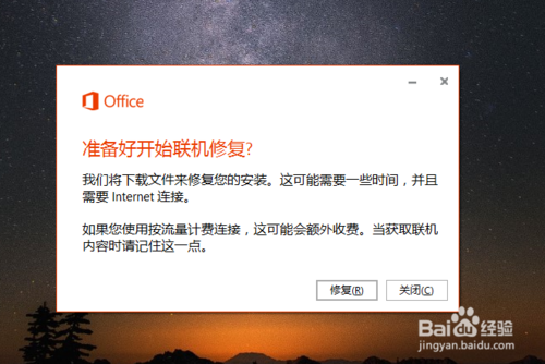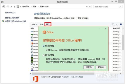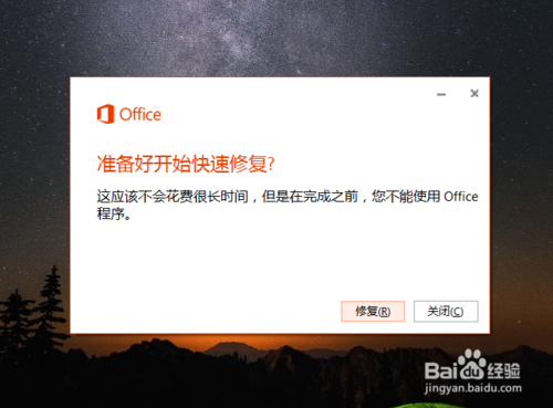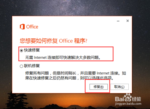 默认“快速修复”,直接点“修复”等待完成,关闭窗口,即可正常使用office2016。