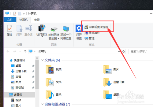 此时,如果你使用的操作系统为Windows 10操作系统,那么可以直接打开计算机界面,在计算机页面中找到“卸载或安装程序”按钮。