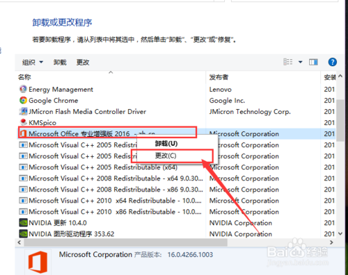 接下来,在打开的应用程序列表中找到在本台计算机中安装的Office 2016软件,然后对着该程序击右键,选择“更改”选项。