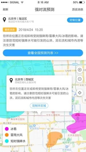 雹风雨app支持定制区域,提供定制区域的天气提醒。