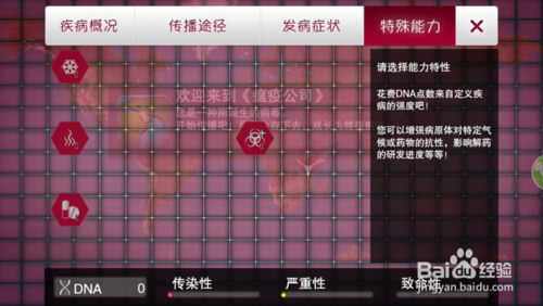 1、基础病原体下,增强能力包括抗寒能力、抗热能力、抗药能力和病原体的特殊能力,一些特殊能力可以弥补病原体先天性的不足,也可以取代它类症状属性能力来节省DNA 点数的消耗,或者是削弱其在游戏世界的严重性程度,因而在进化前务必再三确认而后行。2、抗寒能力和抗热能力: