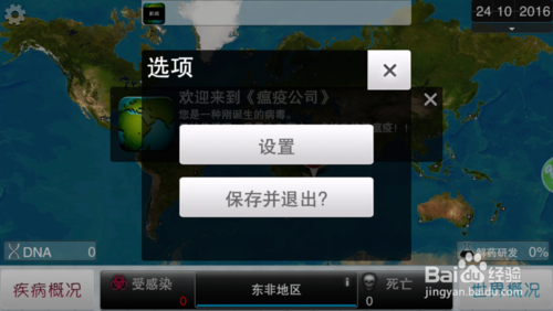 在游戏中系统每次有消息的时候,时间都是停止的,这时你可以在里面查询下一个需要加那个点,还差多少,以便攒够以后及时加点,而且你进入病情概况或世界概况的时候时间同样是停止的,这时你可以查看一下有哪些地方还没有被感染,看看这些国家是属于什么样的气候,热,还是冷,或者这个地方鸟类多,贫穷等等,来判断如何选择传染的加点方式,也可以点右上角的按钮来让时间停止,游戏时间是以一个月为单位,开始时间就是你玩游戏投放病毒那天,也可以点右上角的设置,来保存退出游戏,下次你还可以接着玩,也可以点手机上的返回键来保存退出。