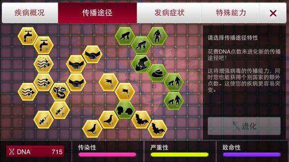 例如:可以通过空气来传播,然后在加点到空气传播2级后,就可以通过飞机往返各个国家的特性,来把病毒传播到其他国家中去,来加大感染面积和感染速度,一般来说,感染的基数越大,感染的人就会成倍增长,其实不止在传播途径里可以提高病毒的传染性,在发病症状和特殊能力板块也可以提高病毒的传播性。