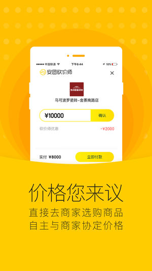 - 展示与安团签约砍价师服务的商家,让您在百忙中不必一家家跑,打开手机APP,一家家选择,一家家看看。真正在家里挑选自己喜欢的品牌。