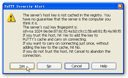 这是要告诉你登录的主机密钥指纹,点 Yes 就保存起来,以后就不会再弹出这个窗口,然后就正常登录。点 No 不保存,下次还是要提示你,然后也可以正常登录。如果一台主机我们只是临时登录一下,当然就是点 No 了。Cancel 就是取消,也就是取消了这次登录。