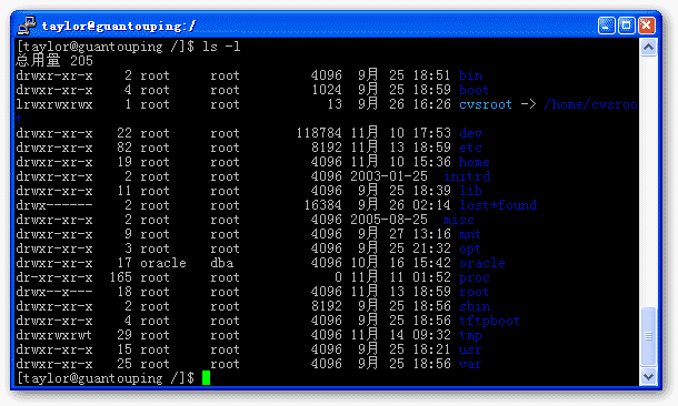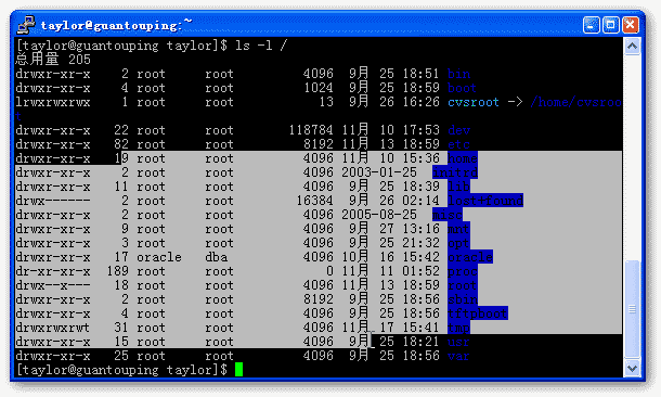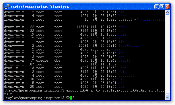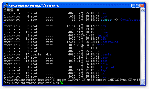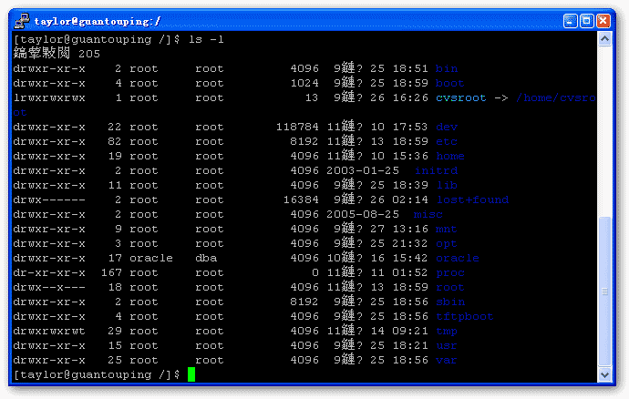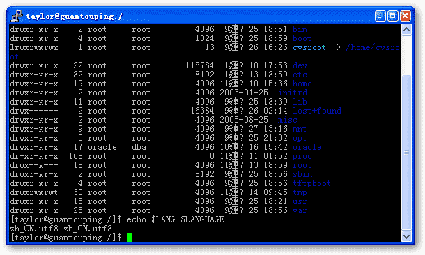 成功登录主机后,输入命令,这……这……显示,又是乱码。唉,中文乱码是一个老生常谈的问题,提起来就头大。原因嘛,不外乎字符集、终端编码之类的,还是可以解决的。