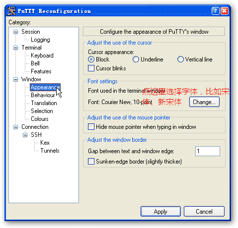 打开Putty程序,在主界面找到“Appearance”项,然后点击"change"按钮,进入修改配置界面。
