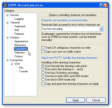 选择配置窗口左边的 Translation,在右边的 Received data assumed to be in which character set 下拉列表中选择最后一个“Use font encoding”,最后点下面的 Apply 按钮就生效了。